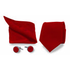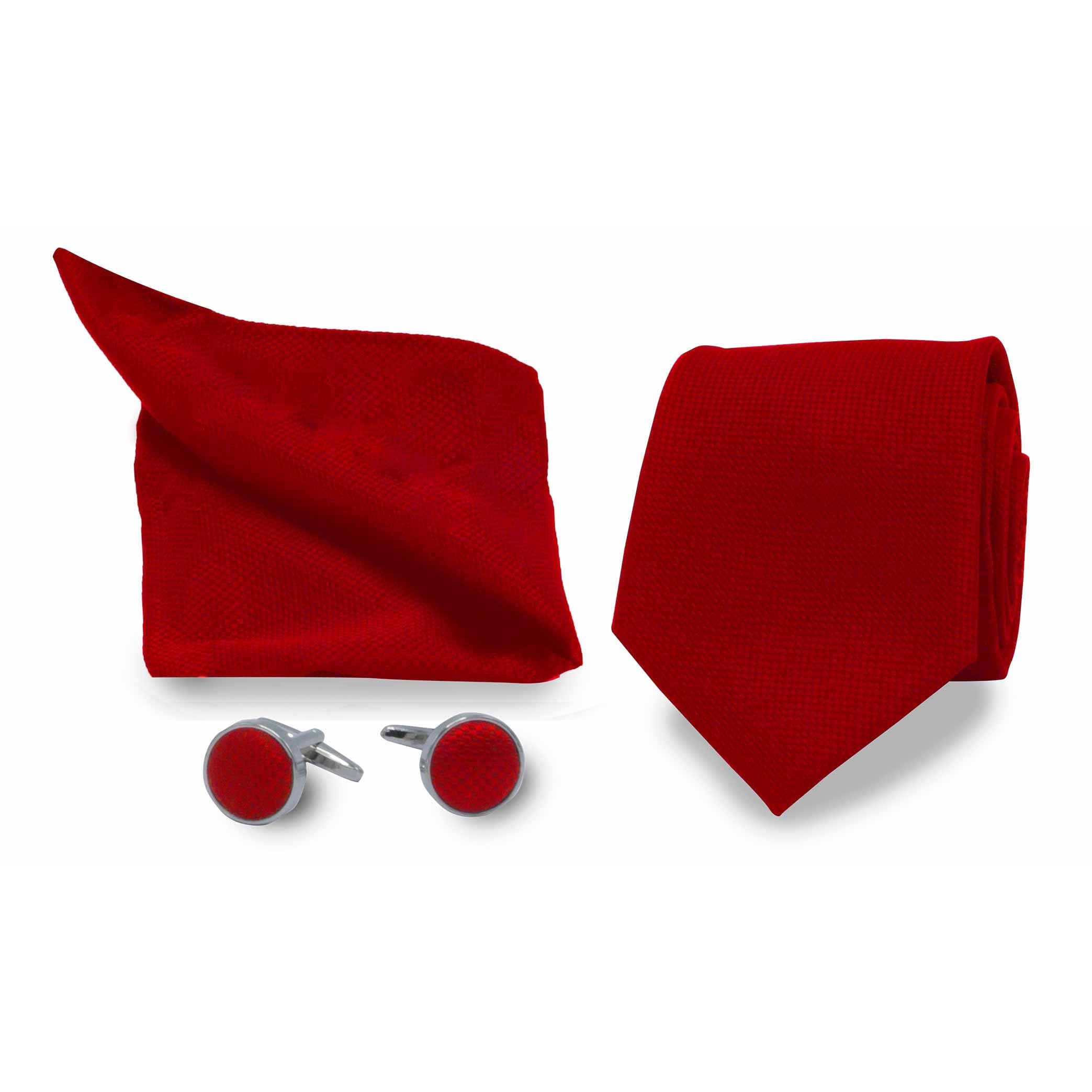 Deze set bestaat uit een prachtige rode das, bijpassende manchetknopen en een pochet, allemaal perfect op elkaar afgestemd. De das heeft een subtiele satijnglans, wat zorgt voor een luxe uitstraling. De manchetknopen zijn voorzien van een verfijnd patroon dat je outfit net dat beetje extra geeft. Het pochet voegt samenhang en stijl toe aan je look.