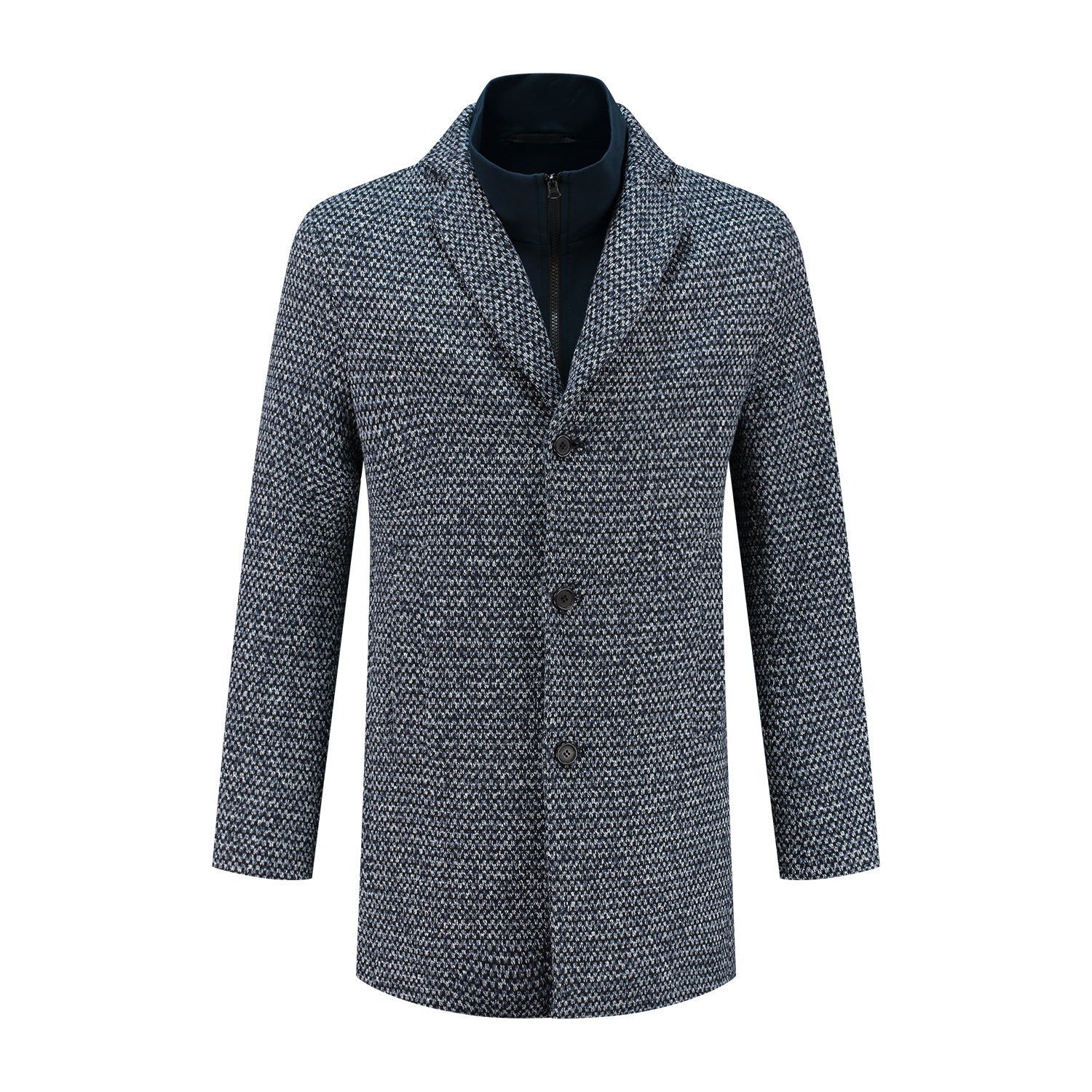 Je ziet een moderne coat windvanger met strak silhouet en blauw structuurweefsel. De ingebouwde windvanger met rits en hoge kraag geeft de voorkant een gelaagde look. Ontworpen voor combinaties met heren pakken en elk heren kostuum, met nette afwerking en sterke constructie.