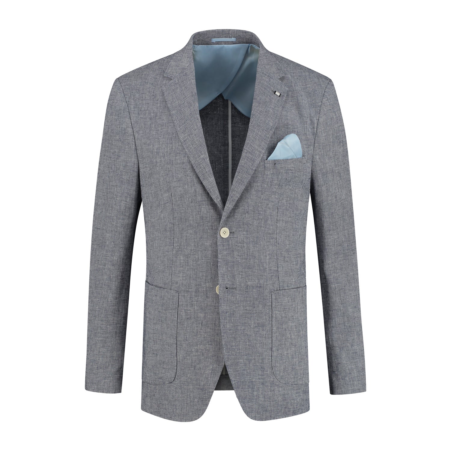 Stel je voor: een licht, ongevoerd colbert dat strak oogt zodra je het pakt. Deze modern fit uitvoering in blauw linnen-katoen is clean, tijdloos en sluit perfect aan bij heren pakken en heren kostuum. Tweeknoops, notch-revers en opgestikte zakken houden het eigentijds.