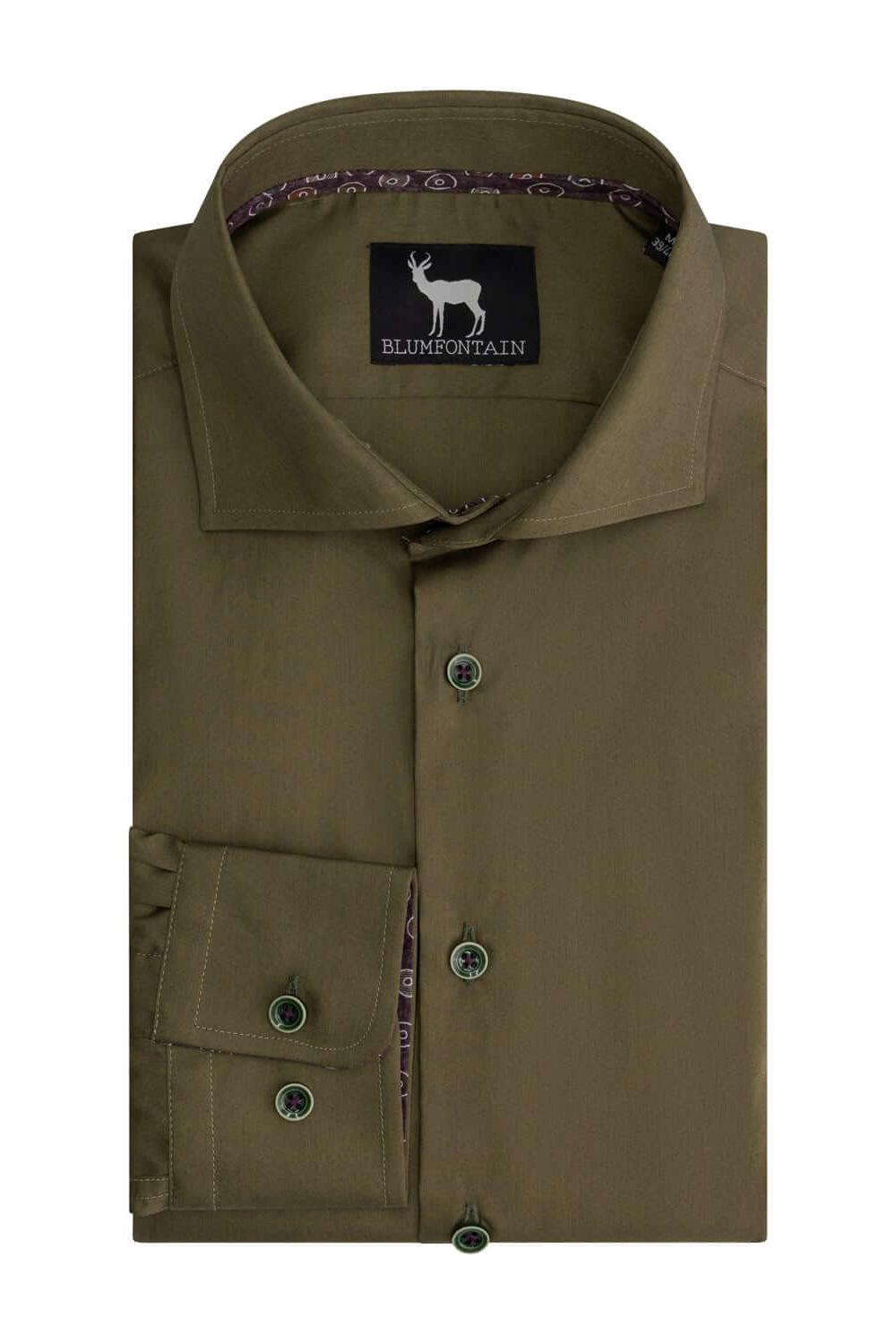 Blumfontain overhemd uni groen is een ademend katoenen overhemd met een moderne pasvorm (modern fit) en subtiele contrasterende details die zowel zakelijk als casual gedragen kan worden. Dankzij het 100% katoenen materiaal geniet je van ademend comfort de hele dag en is het overhemd machinewasbaar op 30°C, terwijl de stevige knopen en contrasterende details zorgen voor duurzaamheid en een stijlvolle afwerking.