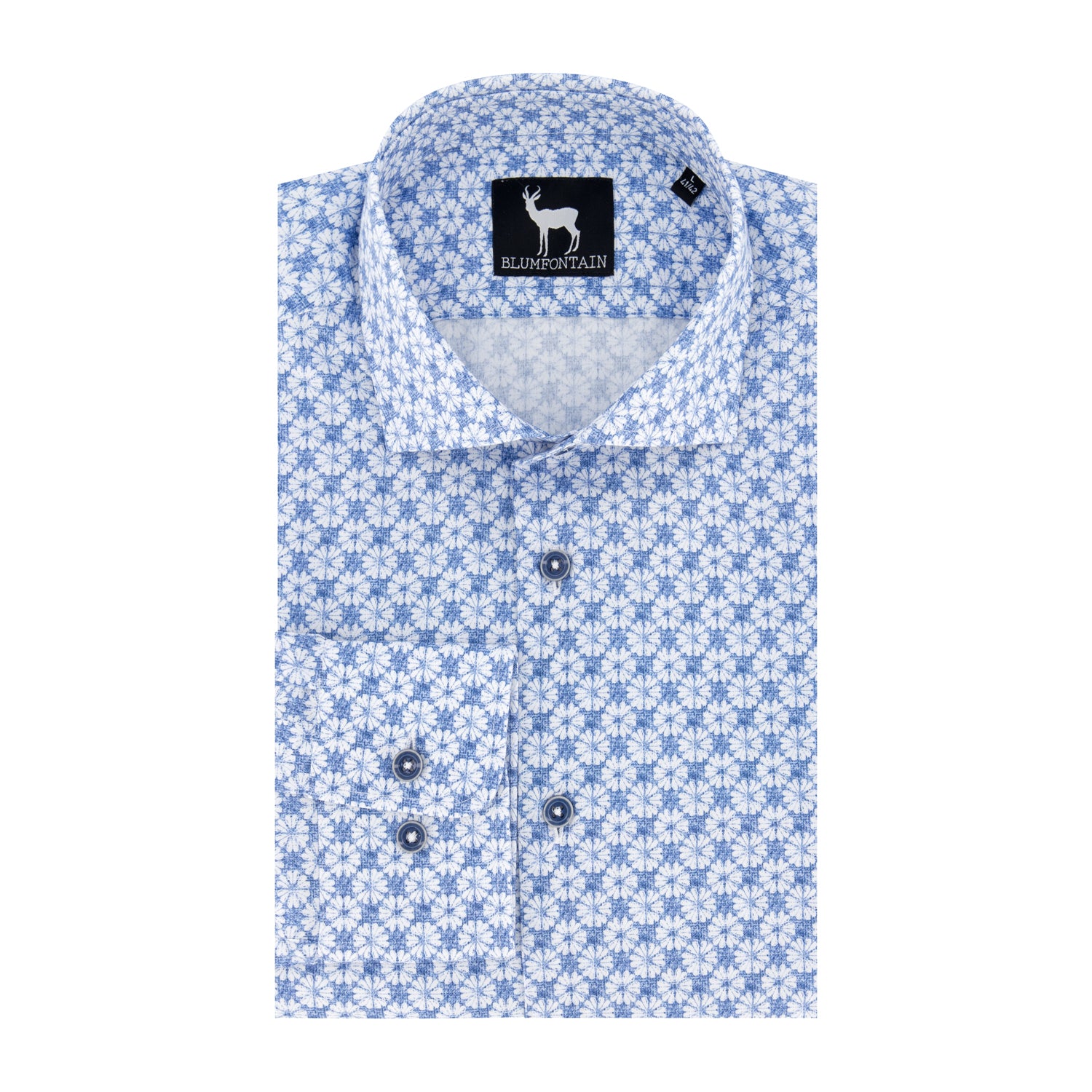 Morgen hangt dit Blumfontain overhemd klaar: blauw, katoen en met een subtiele bloemprint die direct werkt onder colbert, smoking of maatpak. Je combineert het moeiteloos met heren pakken en heren kostuum.