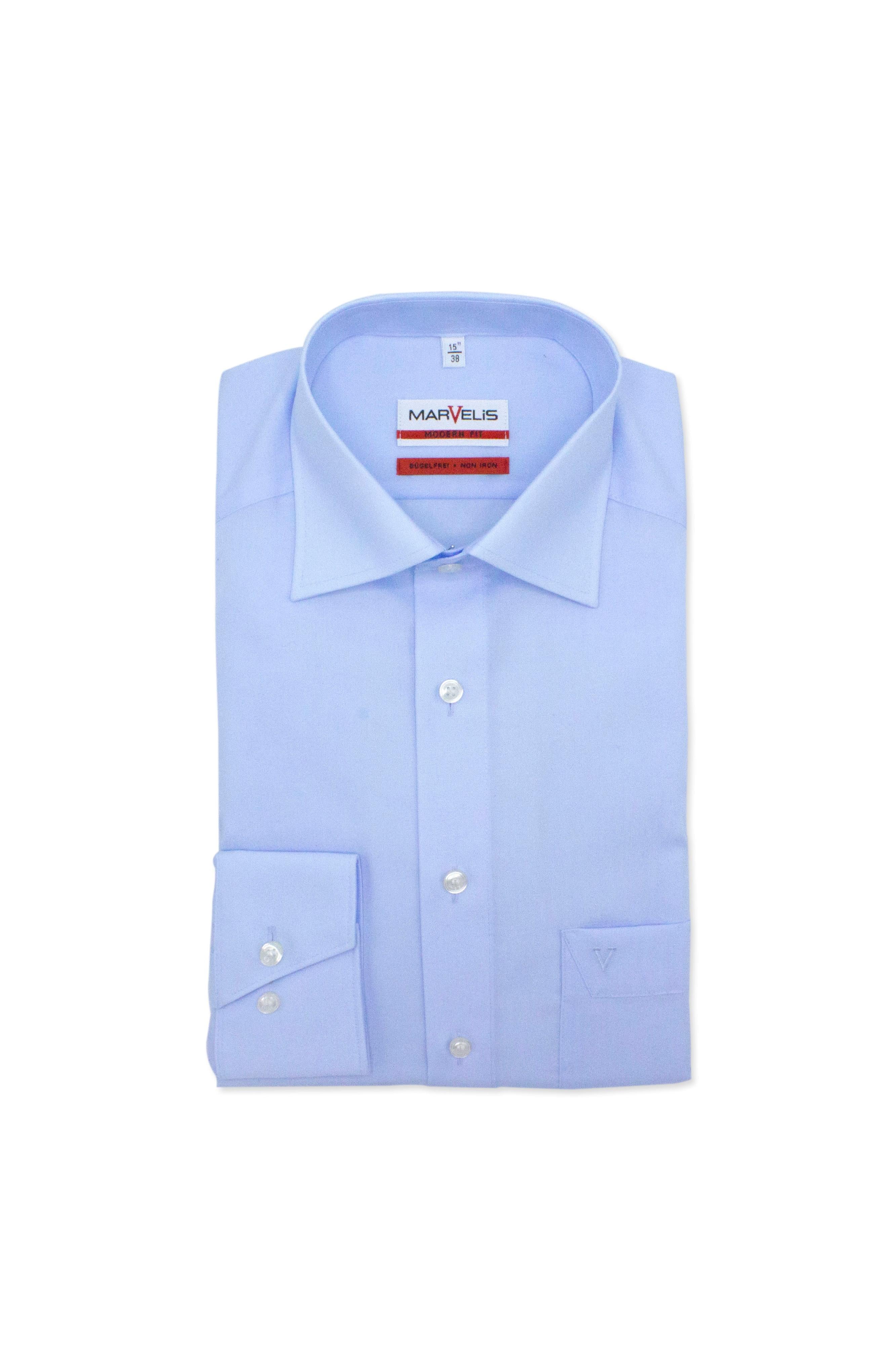 Marvelis modern-fit blauw is een katoenen overhemd voor heren met een moderne pasvorm en een nette knoopsluiting, ideaal voor een verzorgde zakelijke en casual look. Het ademende katoen en de strijkvrije afwerking zorgen voor comfort en gemakkelijke verzorging, waardoor dit overhemd lang meegaat en zich leent voor kantoor, meetings en vrijetijd.