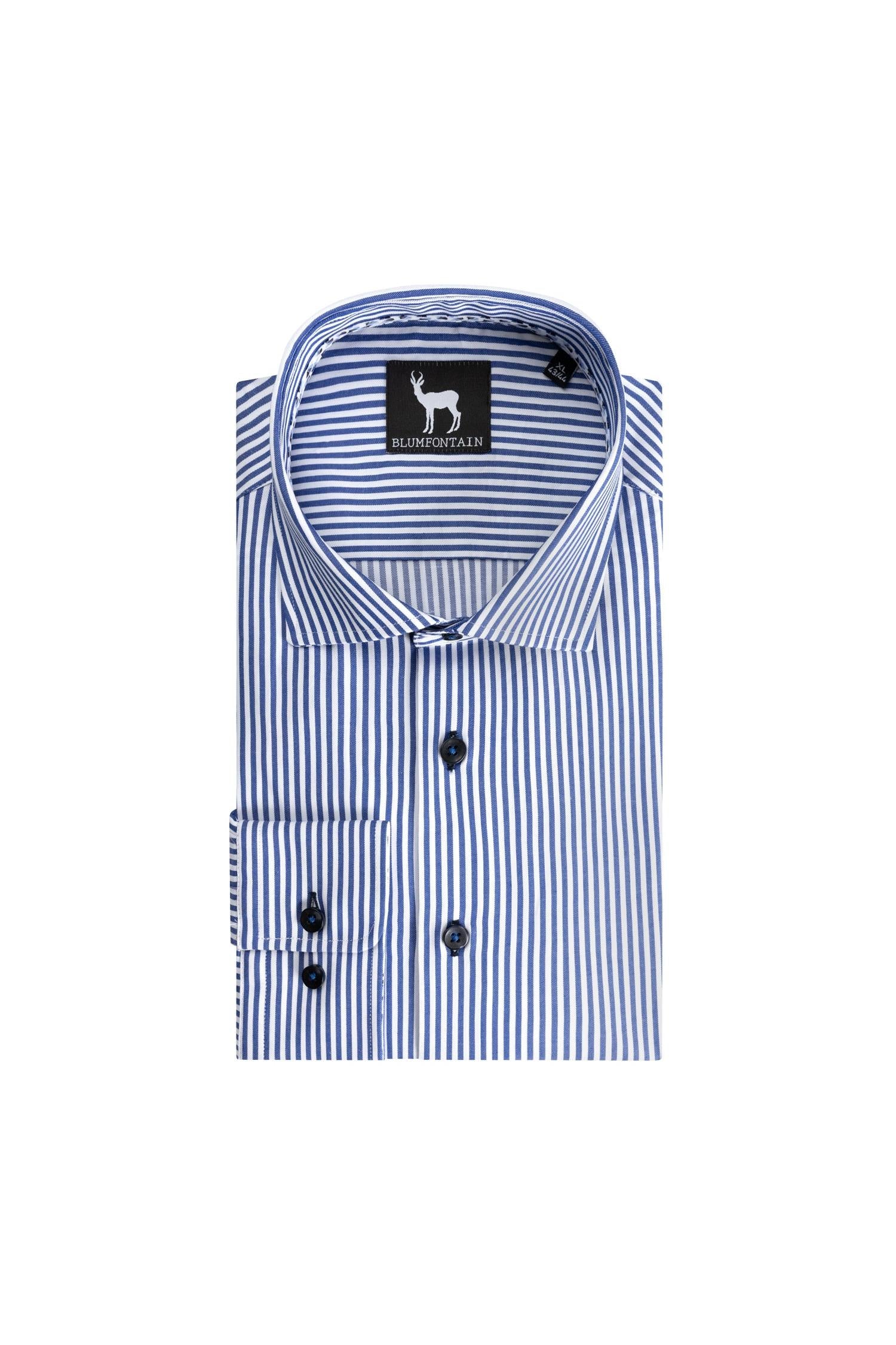 Blauw-wit verticale katoenen overhemd met semi-spread kraag en regular-fit van Blumfontain biedt comfort en een moderne, professionele uitstraling voor dagelijks gebruik op kantoor. Het overhemd is gemaakt van 100% katoen, heeft verstevigde naden voor duurzaamheid en is machinewasbaar, waardoor het gemakkelijk te onderhouden is en moeiteloos combineert met blazer of jeans voor kantoor en formele gelegenheden.