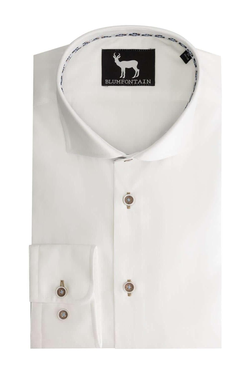 Blumfontain uni wit is een 100% katoenen overhemd met een moderne fit dat comfortabel om het lijf valt en karakter krijgt door contrasterende lichtblauwe knoopsgaten en een subtiele lichtblauwe print aan de binnenkant van boord en manchetten. Het is ideaal voor kantoor en dagelijks gebruik en vormt een tijdloze basis die makkelijk te combineren is met pak of jeans, terwijl ademend katoen comfort biedt gedurende de hele dag.