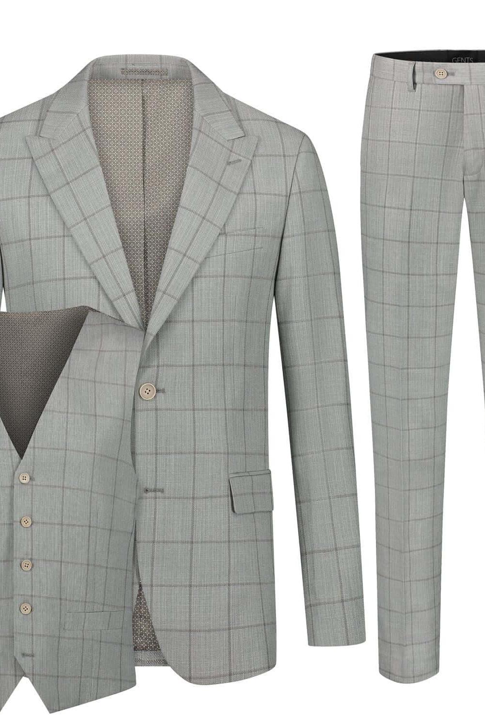 Het zandkleurige Pak 3-D Ruit van GENTS is een driedelig pak met een subtiel 3-D ruitpatroon, bestaande uit colbert, gilet en broek van kreukvrij polyester dat onderhoudsvriendelijk is en zo lang fris oogt.