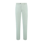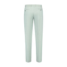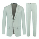 Binnenkort staat een dusty groen slim fit pak centraal in elke look: een tweeknops colbert met notch revers, klepzakken en borstzak, plus een nette pantalon met riemlussen en scherpe pers