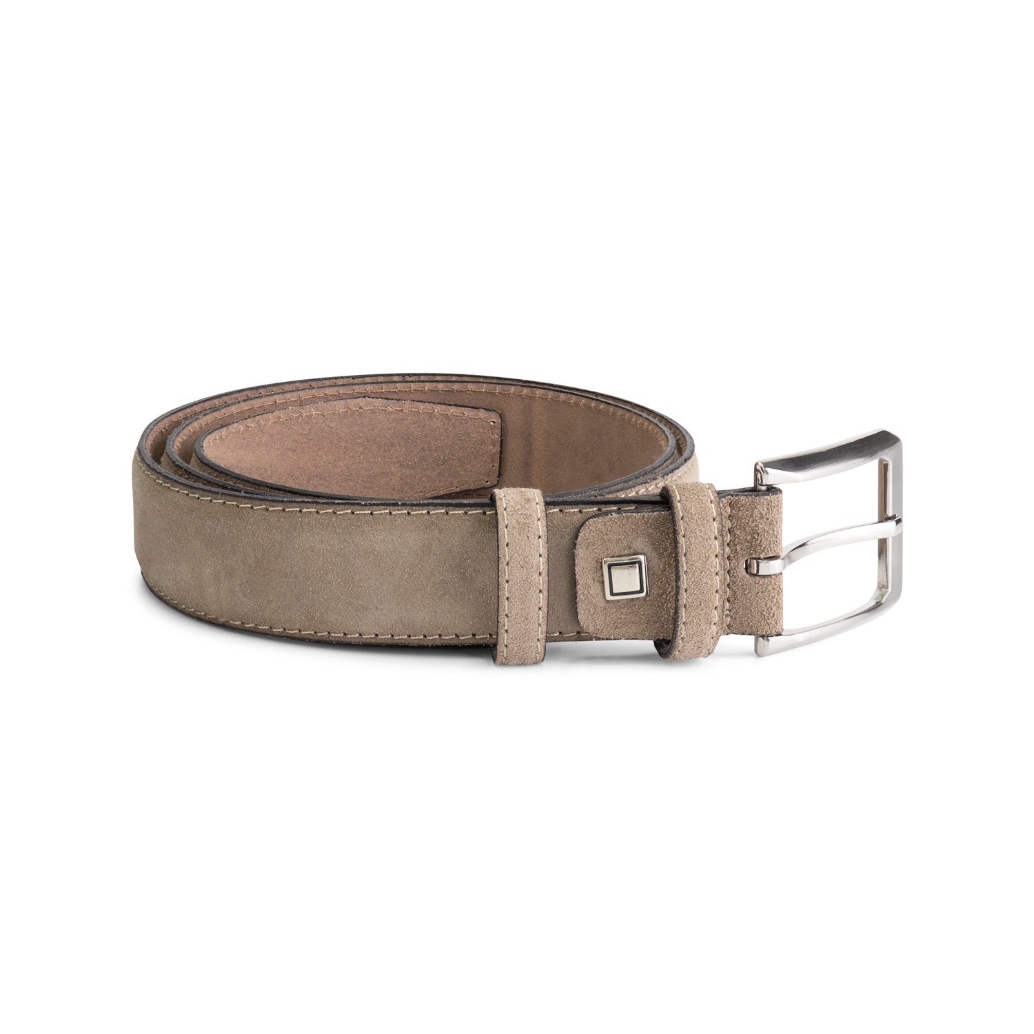 Binnenkort maak je je look af met een zandkleurige suède riem met strakke stiknaden en een gepolijste metalen gesp. Een tijdloze, neutrale aanvulling die matcht met heren pakken en heren kostuum.