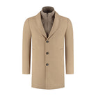 Je kiest voor een bruine overcoat met modern silhouet, klassieke revers en een geïntegreerde windvanger: een licht gewatteerd binnenfront met staande kraag en rits. De mix van polyester en wol levert een nette, tijdloze look die past