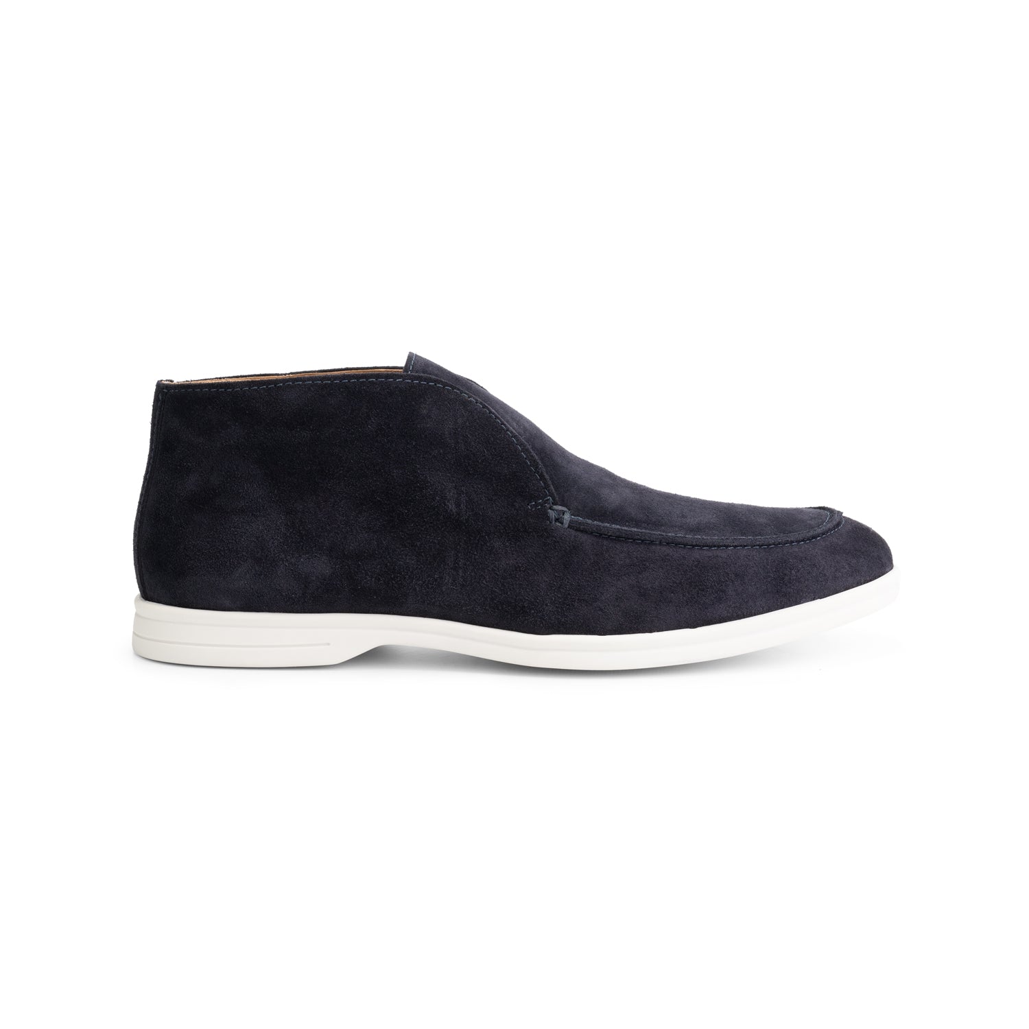 Straks combineer je deze hoge instapper van suède moeiteloos met heren pakken en heren kostuum. Het minimalistische silhouet met moc-neus en strakke lijnen wordt aangevuld door een frisse, contrasterende witte zool. Een moderne loafer met een cleane afwerking.