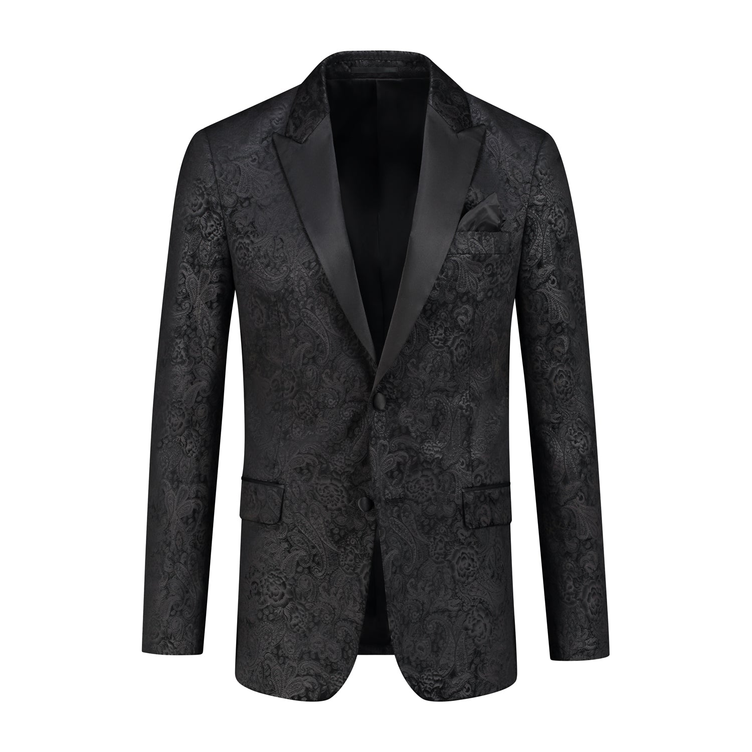 Je kiest voor een dinnerjacket dat meteen opvalt: fluweel-look met ton-sur-ton jacquardprint, satijnen shawl-revers en strakke afwerking. Klaar voor elk formeel moment en matcht moeiteloos met heren pakken en heren kostuum.