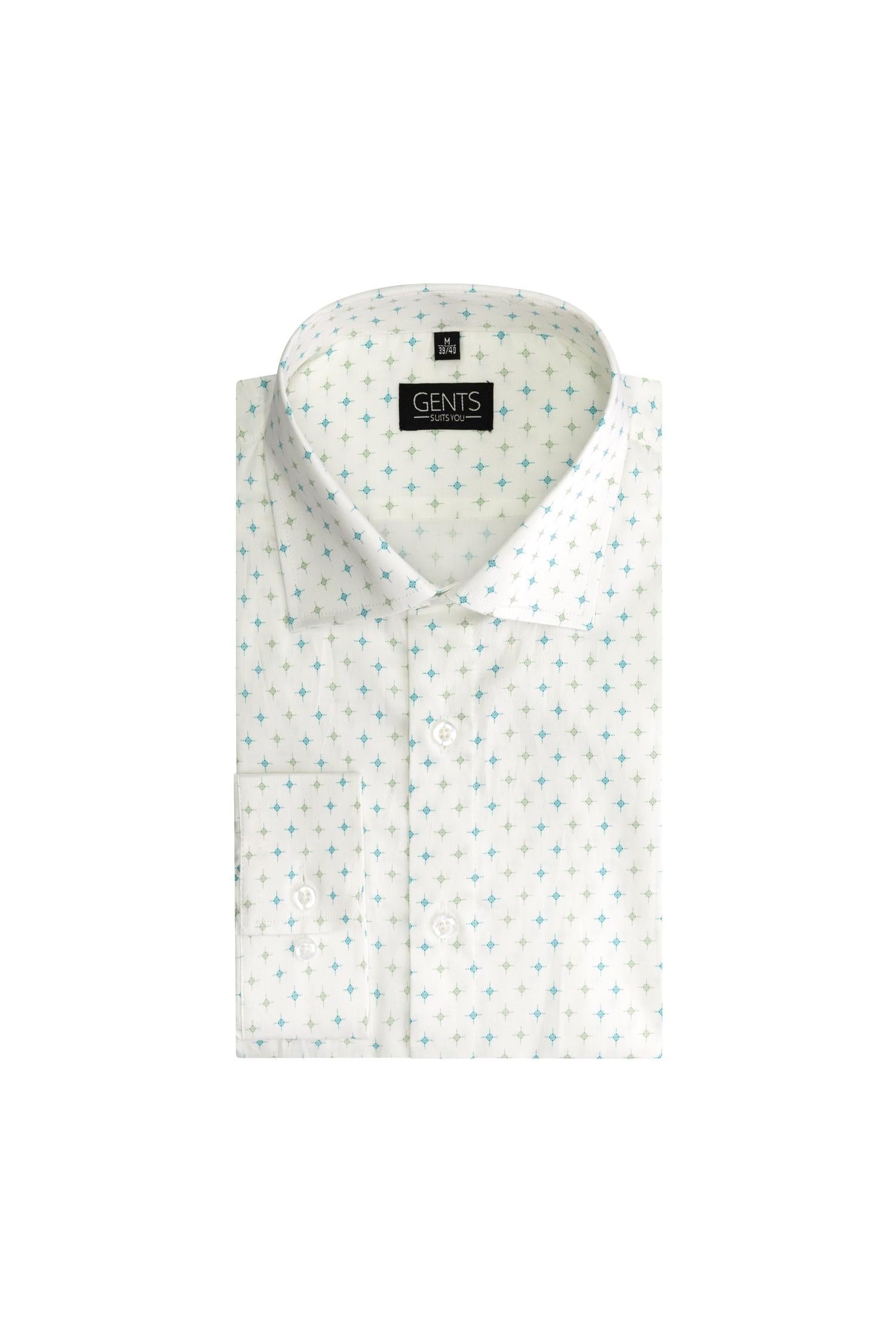 Ster Blauw Groen is een regular fit katoenen overhemd met een stervormig patroon in aqua en groen op een witte achtergrond, waardoor het zowel zakelijk onder een groen linnenpak als casual met een jeans kan worden gedragen. Het ademende 100% katoen biedt daglang comfort en is praktisch in onderhoud: wassen op 30–40°C en drogen aan de lijn of op lage temperatuur in de droger.