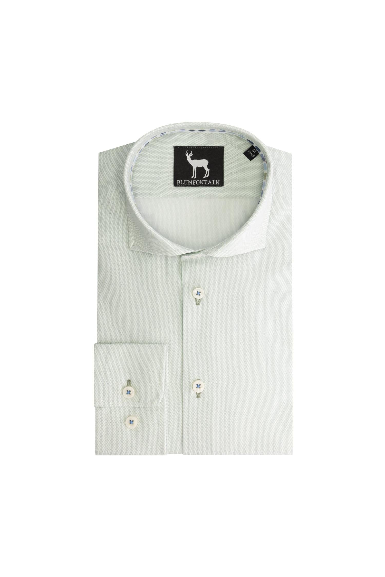 Blumfontain honingraat overhemd in lichtgroen, gemaakt van 100% katoen met regular-fit, klassieke kraag, lange mouwen en knopen middenvoor, voorzien van een honingraatdessin en subtiel contrasterend stiksel bij de knopen voor een verfijnde afwerking. Ideaal voor kantoor, evenementen of dagelijks gebruik onder een colbert of das; ademend katoen biedt comfortabel draagcomfort en behoudt zijn vorm, terwijl het Blumfontain-logo met hert in de nek voor een subtiel kwaliteitsaccent zorgt.