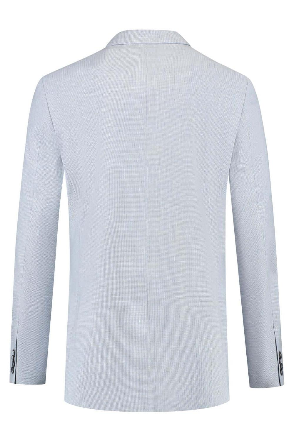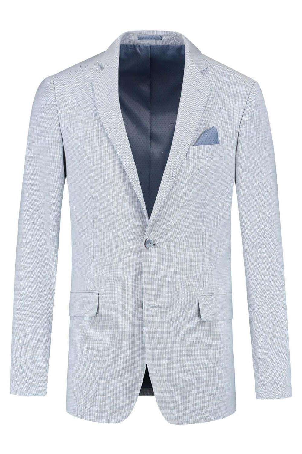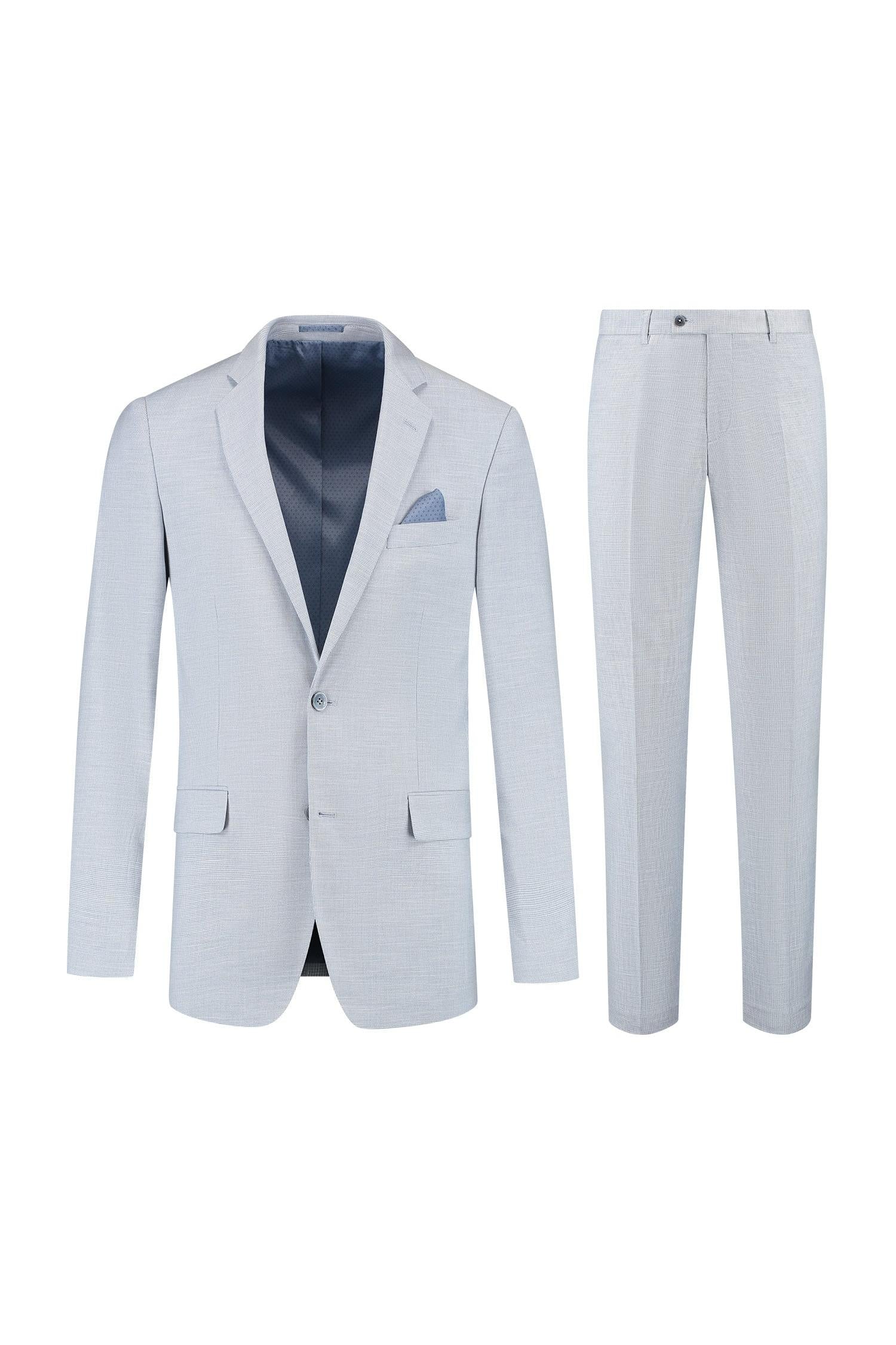 Het 2-D Structuur Pak in lichtblauw bestaat uit blazer en broek met een subtiele 2-D structuur en een moderne pasvorm, vervaardigd uit een comfortabele polyester-viscose-spandex blend die ademend is en kreukbestendigheid biedt dankzij Easycare. Ideaal voor zomerse bruiloften en andere formeel-casual gelegenheden, te dragen met een licht overhemd en een bijpassende stropdas of vlinderdas voor een stijlvolle, onderhoudsvriendelijke look die de hele dag fris blijft.
