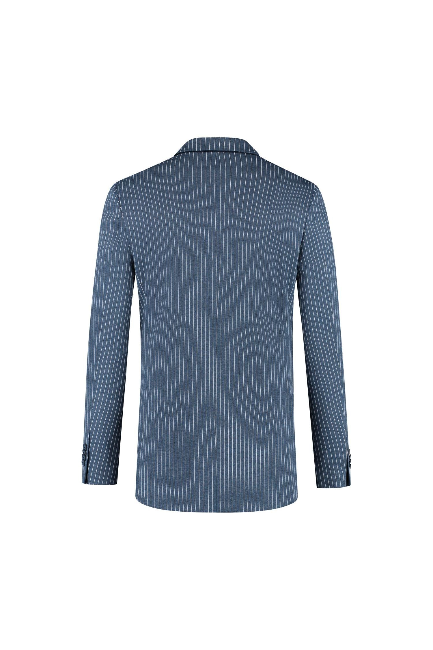 Het Pak Krijtstreep Denimblauw is een 2-delig slim-fit pak van stretchstof (polyester viscose spandex) met een denimblauwe tint en subtiele krijtstrepen, uitgerust met klepzakken en een borstzak voor pochet. De blazer heeft revers en een dubbele knoopsluiting, de pantalon een scherpe persplooi en verstelbare tailleband voor comfort, en dankzij Easycare blijft het geheel kreukvrij en makkelijk te onderhouden voor lange dagen op kantoor of bij formele gelegenheden.