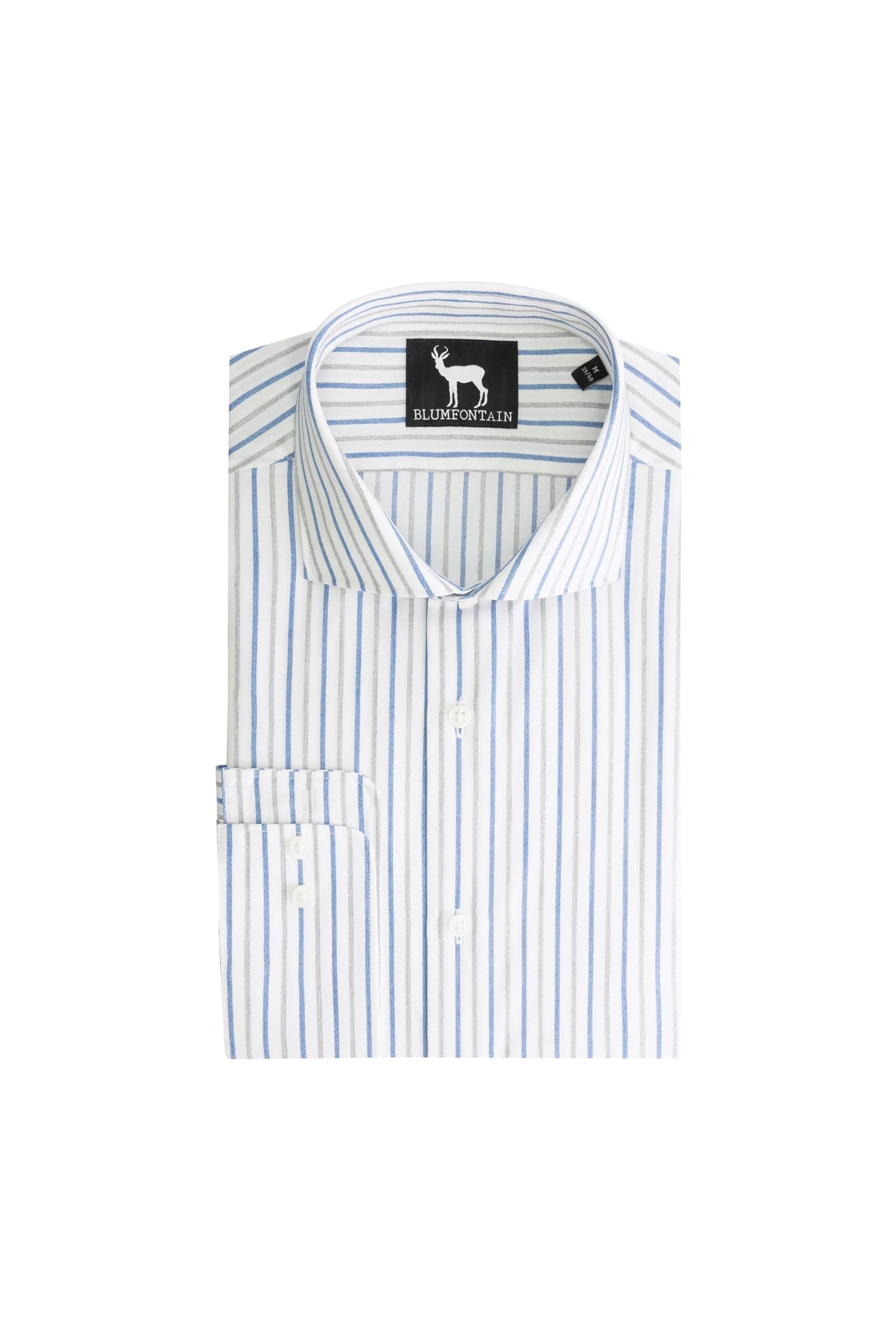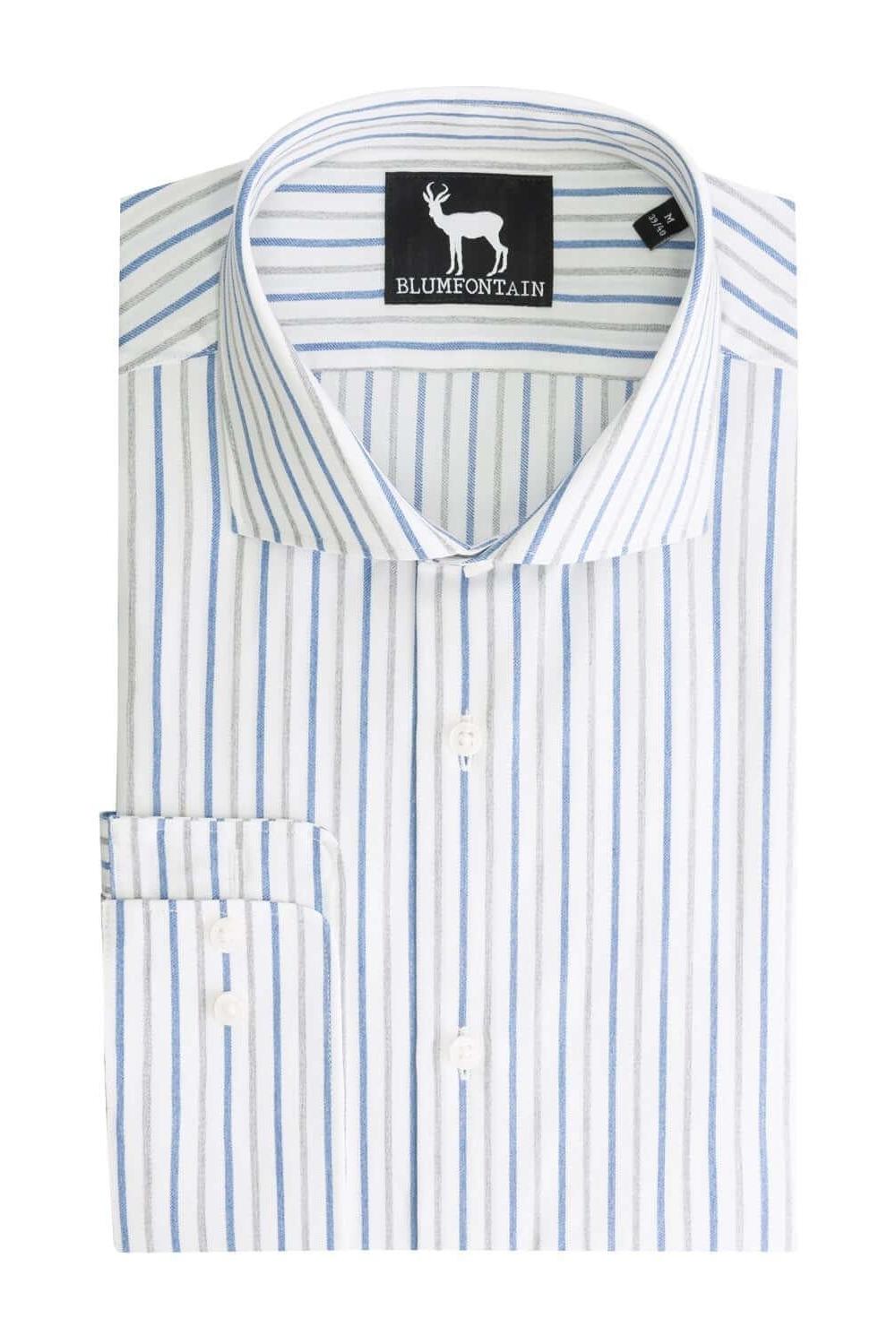 Blumfontain overhemd met grijsblauwe strepen is een ademend katoenen overhemd met een klassieke kraag en dubbelmanchet, ideaal voor een elegante en comfortabele look op kantoor. De regular-fit pasvorm en het tijdloze streeppatroon maken dit overhemd veelzijdig onder een pak of casual met een nette broek, waardoor het geschikt is voor formele gelegenheden en dagelijks professioneel voorkomen.