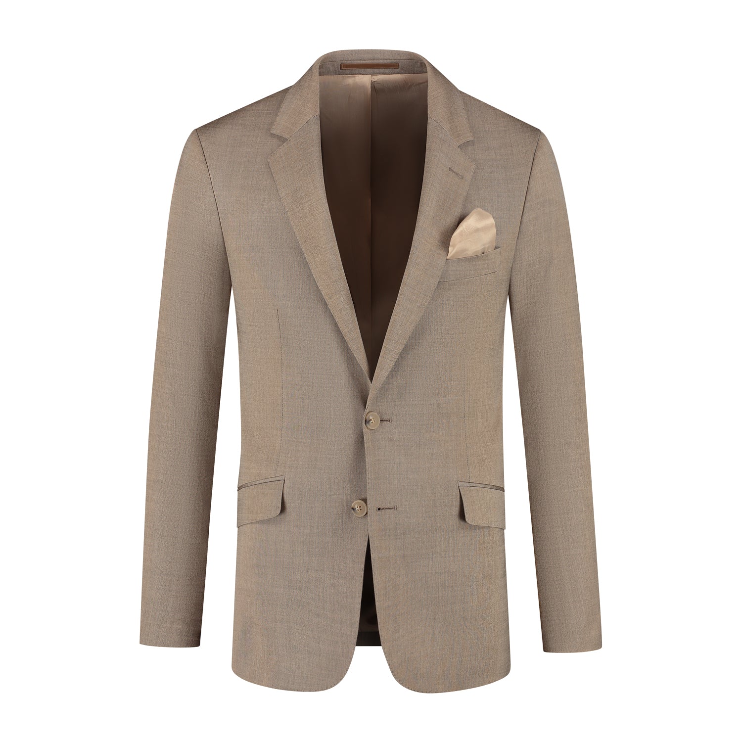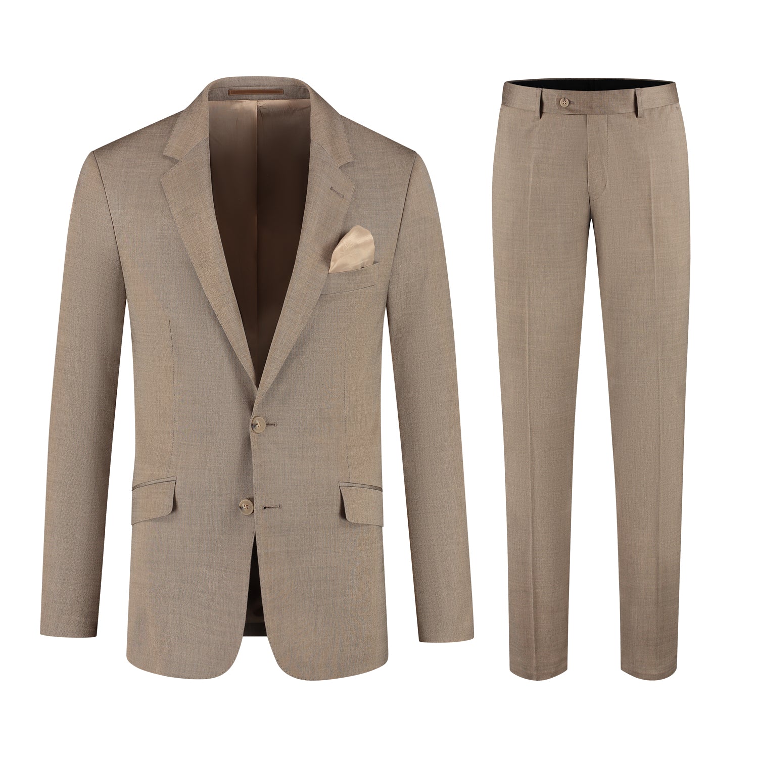 Het camelbruin tweedelig pak van wol met viscose en elastan biedt een tijdloze zakelijke uitstraling met een moderne pasvorm en stretch voor comfort gedurende de hele dag. Deze set is ideaal voor kantoor, zakelijke afspraken en formele gelegenheden zoals een bruiloft, met een klassieke revers en klepzakken die zorgen voor een nette, professionele uitstraling en veelzijdig draagcomfort.
