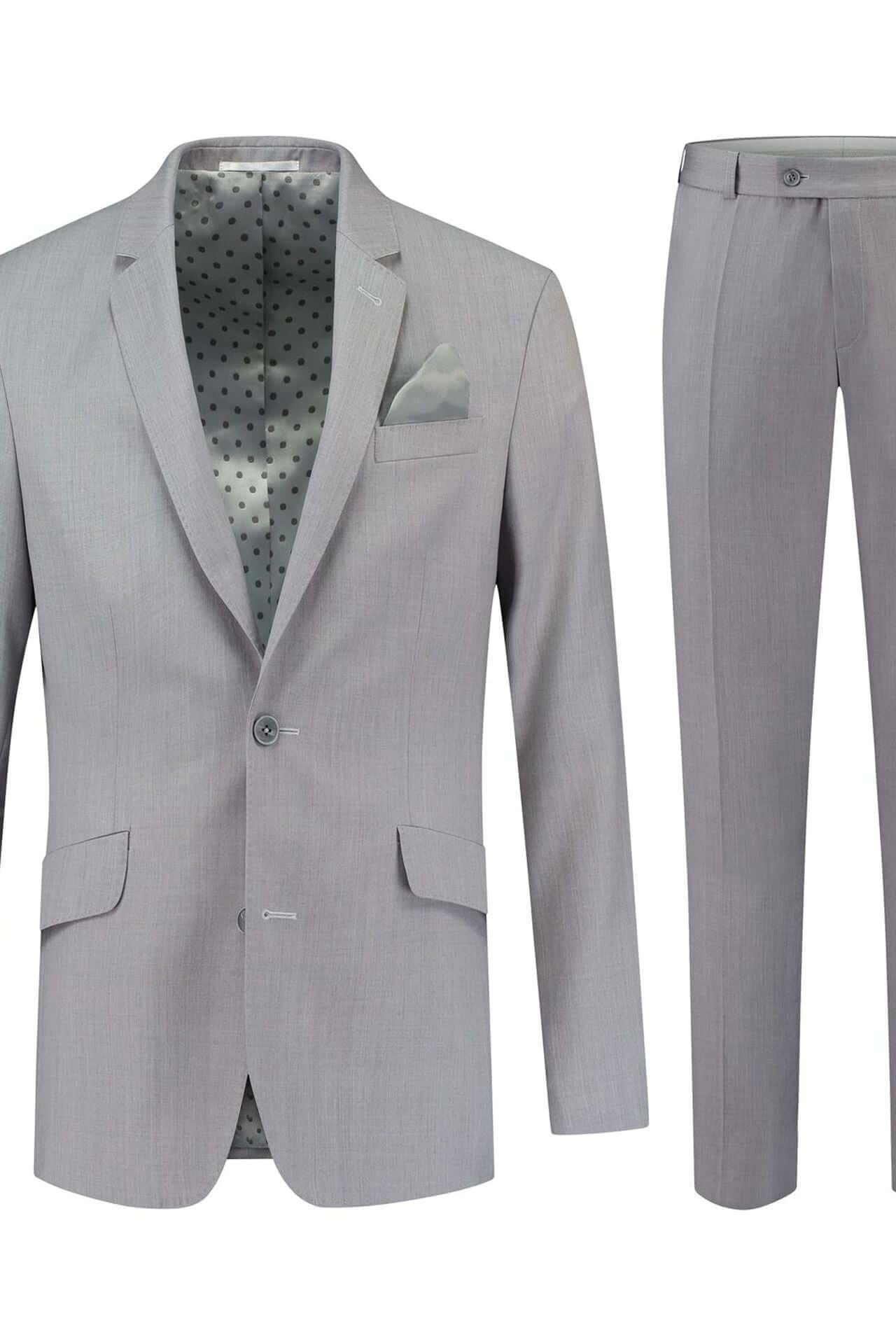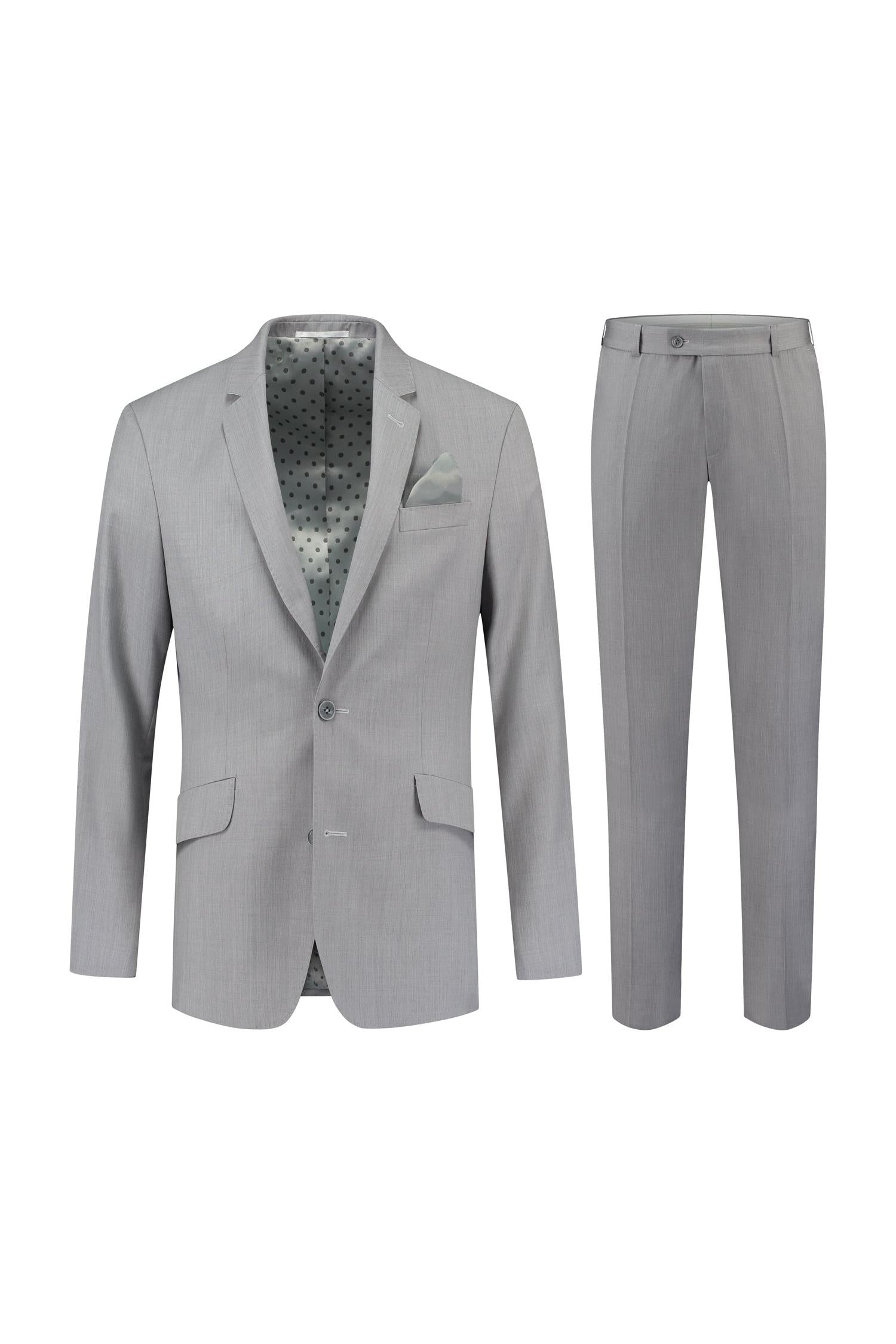 Het perSignori Lichtgrijs 2-Delig Pak is een slim-fit herenpak van 100% wol met een elegante revers en discrete zakdetails, uitgevoerd in een verfijnde lichtgrijze tint die professioneel en modern oogt. Dit zakelijke pak is ideaal voor zakelijke meetings en formele gelegenheden, biedt ademend comfort en een gestroomlijnde silhouette die moeiteloos combineert met een luxe overhemd en gepolijste schoenen.